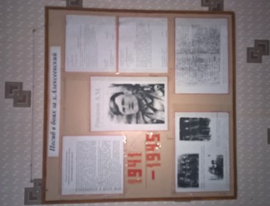 Экспозиция уголка разместилась на 4 стендах и прилегающей к ним витрине, в которой расположено более 20 экспонатов, среди которых награды и медали: «За боевые заслуги», «За оборону Кавказа», «За отвагу», , личные вещи участников Великой Отечественной войны, фотографии тех, кто ценою своей жизни отстоял нашу Родину.- Участники боевых действий- Никто не забыт, ничто не забыто;- Переписка с родственниками воинов, захороненных в братской могиле на территории х.Алексеевский.